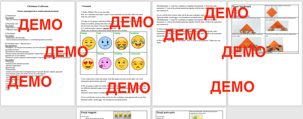 Готовый сценарий мероприятия Emoji Craft Room в формате воркшопа по созданию поделок разного плана в виде смайликов (emoji magnet, empji pom-pom). Мероприятие проводится на английском языке. Подобный мероприятия отлично показывают себя: ведь помимо практики языка, дети получают по итогу поделки, которые могут забрать с собой.