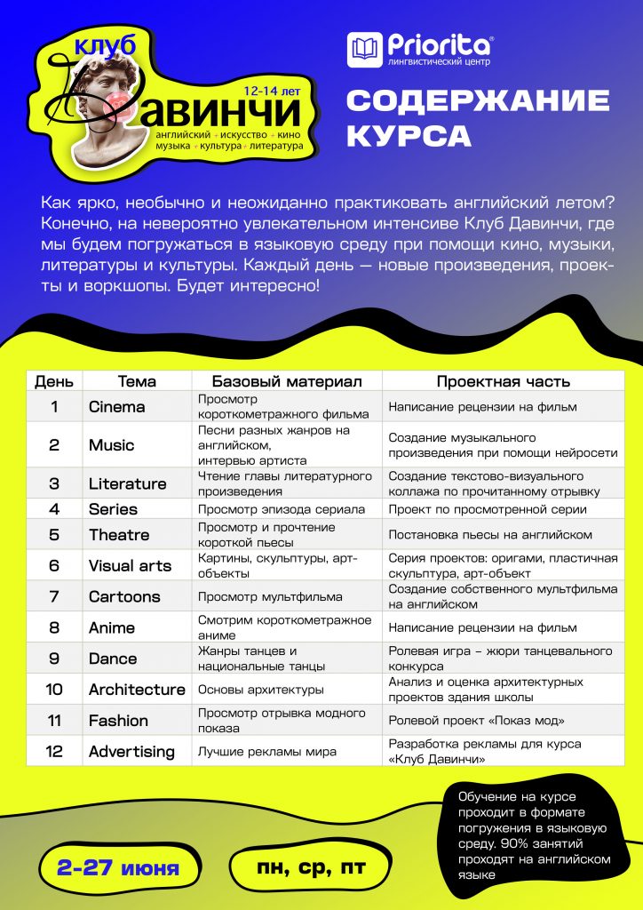 Как ярко, необычно и неожиданно практиковать английский летом? Конечно, на невероятно увлекательном интенсиве Клуб Давинчи, где мы будем погружаться в языковую среду при помощи кино, музыки, литературы и культуры. Каждый день — новые произведения, проекты и воркшопы. Будет интересно!
