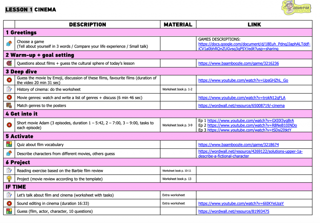 - поурочные планы 12 занятий с детально расписанными этапами, ссылками и реквизитом