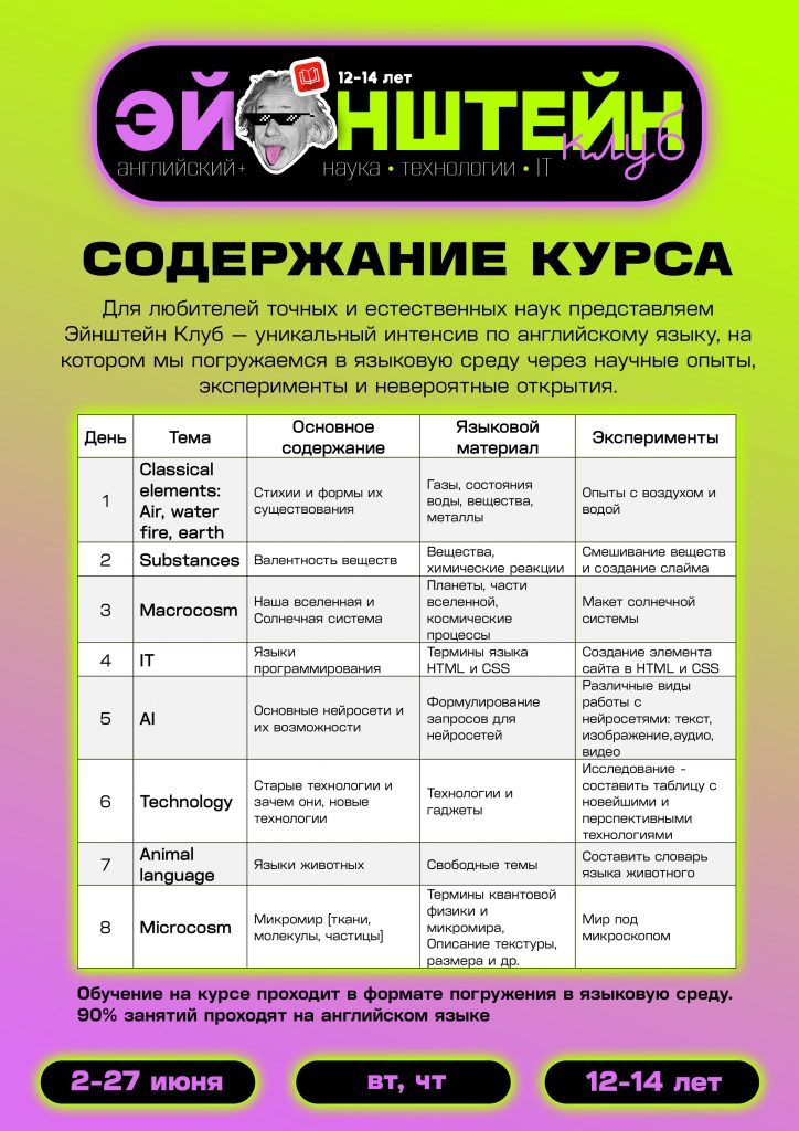 Для любителей точных и естественных наук представляем Эйнштейн Клуб — уникальный интенсив по английскому языку, на котором мы погружаемся в языковую среду через научные опыты, эксперименты и невероятные открытия.