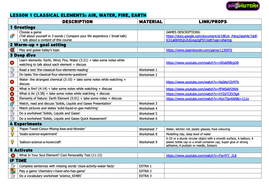 Поурочные планы для интенсива Эйнштейн Клуб (8 занятий по 120 мин.). Летом нужно крутиться! Вот мы и придумали крутой курс для школьников 12-14 лет, который в формате лагеря для подростков позволяет окунуться в языковую среду и познать различные аспекты науки.