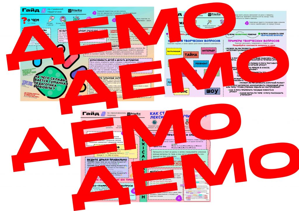 Есть такие методики, которые, как вишенка на торте: если педагог ими владеет, это показывает настоящие высоты мастерства. В данном наборе представлены гайды по трем сложным методикам, которые практикуются в Priorita: гуманная педагогика, лексический подход и творческая педагогика. С помощью этих гайдов педагогам наглядно и кратко изложены основные принципы этих методов, а также способы их применения на занятиях.